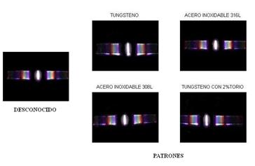 En las tablas (1 y 2) se registran los valores de la correspondencia normalizada, de la autocorrelación y la correlación cruzada entre cada uno de los espectros de los electrodos de Tungsteno puro, acero inoxidable ER 316L, acero inoxidable ER 308L, Tungsteno con 2% de Thorio, aluminio ER 4043 y para acero al carbón ER 70S-6 con cada uno de los patrones.