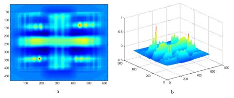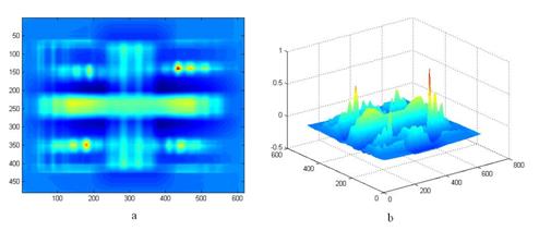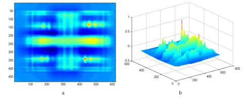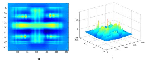 En la gráfica bidimensional (figura 8 a), se muestra la imagen correspondiente al coeficiente de correlación entre el espectro del electrodo de Tungsteno puro “desconocido 1”, y los patrones. Obsérvese la alta intensidad en la posición donde se encuentra el espectro del Tungsteno puro en la plantilla de patrones (188,141). En la gráfica de superficie o tridimensional (figura 8 b), se muestra los picos de la correlación cruzada normalizada. Obsérvese el pico más largo de coeficiente de correlación, en la posición donde se encuentra el espectro del electrodo de Tungsteno puro en la plantilla de patrones.
