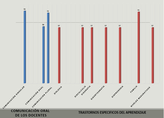 En lo referente a los elementos y niveles de la competencia comunicación oral de los docentes, se evidenció que en la actualidad no todos los docentes de la institución realizan el trabajo viendo las debilidades de cada niño, sino que tratan de cumplir con el programa establecido por el Ministerio de Educación. Existen barreras que han marcado las delimitaciones de la comunicación, con niños que tienen trastornos específicos del aprendizaje, ya que; estas se dan cuando los docentes no les brindan la debida atención, lo que causa conflictos debido a la falta de afecto y respeto. El 70% de los instrumentos aplicados, se comportó de tal manera que los docentes no aplican el lenguaje verbal y no verbal de manera adecuada, evidenciando equivocaciones en el proceso de enseñanza, lo que perjudica a niños con trastornos específicos del aprendizaje